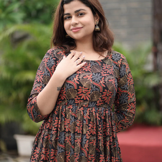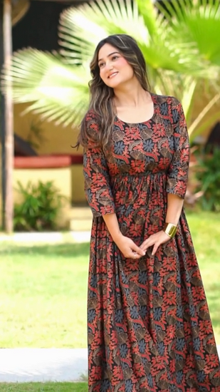 Embrace effortless elegance with the Blue Grace Flared Maxi Dress. Crafted from soft and breathable Rayon, this full-length fit and flare dress is designed to flatter your silhouette while keeping you comfortable. The captivating blue base is adorned with a delicate floral print that adds a touch of femininity and grace. Featuring a classic round neck and 3/4 regular sleeves, it effortlessly blends timeless charm with contemporary style. Ideal for brunches, day outings, or casual gatherings, this western wear piece is a must-have in every modern wardrobe. Pair it with strappy sandals or heels to complete your chic look.