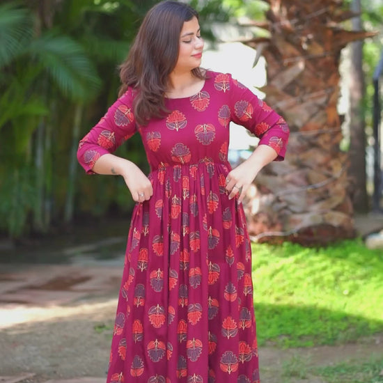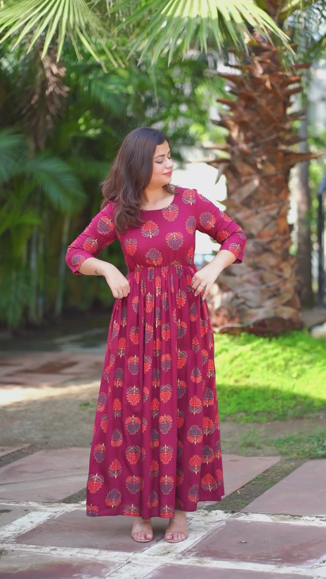 Grace your wardrobe with this Wine Aura Printed Maxi Dress. Crafted from breathable rayon, it features a round neck and elegant three-quarter sleeves. Perfect for western wear, this full-length silhouette offers comfort and charm for everyday style or weekend outings.
